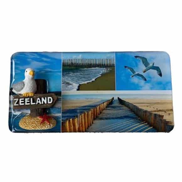 Rechthoekige epoxymagneet met afbeeldingen van Zeeland, met een 3D beeldje erop geplakt van een Zeemeeuw met paalhoofd Zeeland