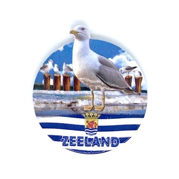 Ronde magneet met een Zeemeeuw, het Zeeuwse wapen en letters Zeeland