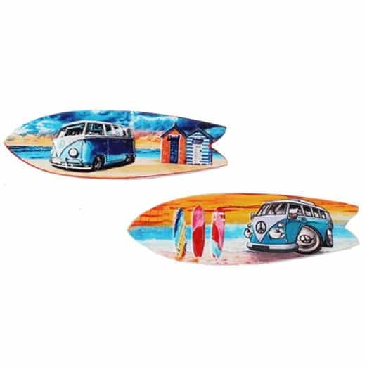 Deze fleurige magneet is gemaakt van polystone, met een afbeelding van een surfersbusje.