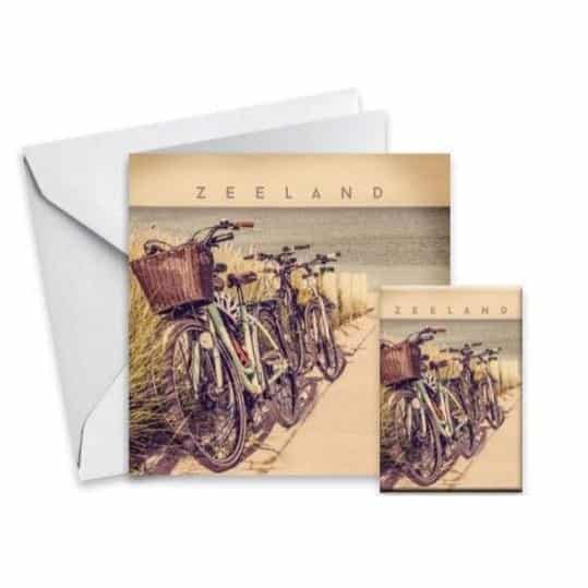 Een vierkant kaartje met een leuke fiets op het strand inclusief magneet.