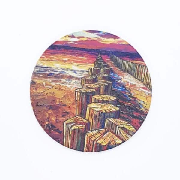 Mooie stevige onderzetter met een keramische afbeelding van strandpalen in zonsondergang kleuren