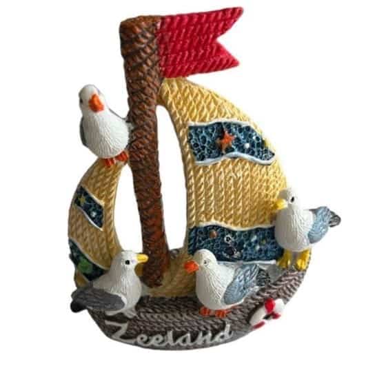 Dit vrolijke decoratie bootje met 4 meeuwtjes van ca 9×10 cm is een vrolijk aandenken aan Zeeland.