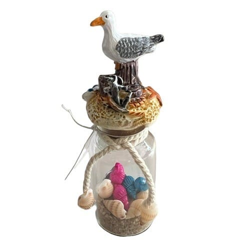 Een glazen flesje met zand & schelpjes, en een meeuw bovenop