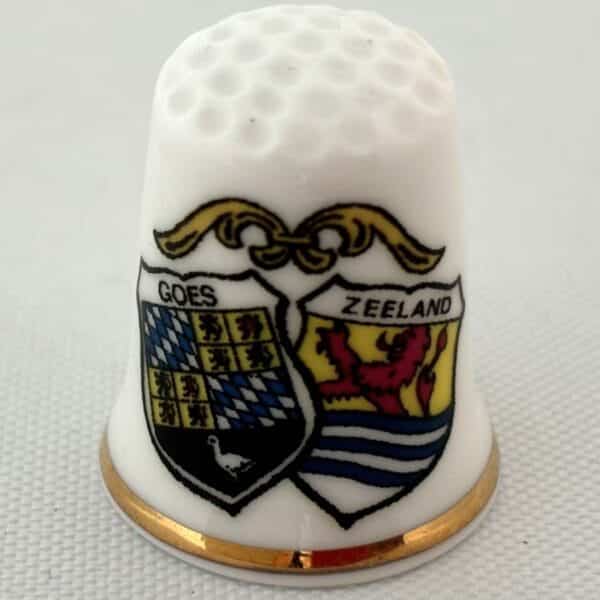 Mooi porseleinen vingerhoedje met de afbeelding van de wapens van Zeeland en Goes.