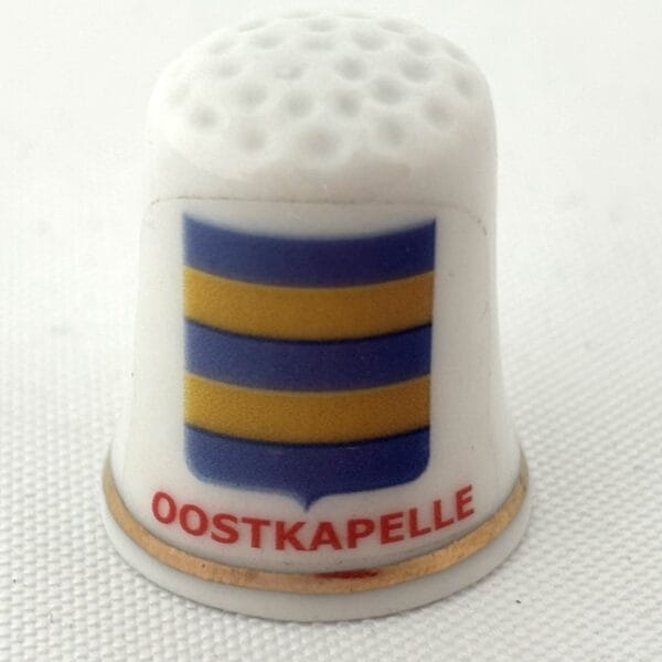 Mooi porseleinen vingerhoedje met de afbeelding van het wapen van Oostkapelle.