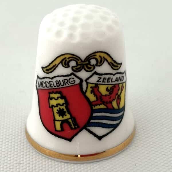Mooi porseleinen vingerhoedje met de afbeelding van zowel het wapen van de Provincie als het wapen van Middelburg.