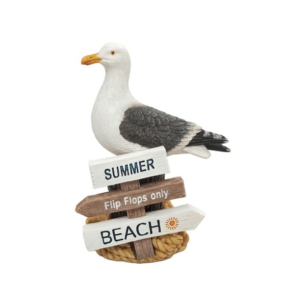 Een meeuw dat op een paalhoofd staat met daarop het woord Summer, beach en flip flops only. Afmeting 10 cm.