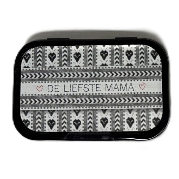 Een leuk blikje gevuld met fruithartjes en de tekst “De Liefste Mama”.