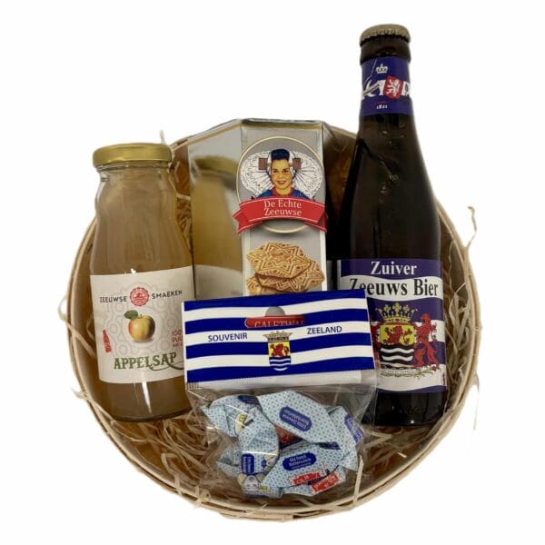 De mand bevat een zakje met babbelaars, een pakje galetwafels, een flesje in Zeeland gebrouwen bier en een flesje Zeeuwse Smaeken sap.