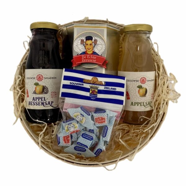 Deze mand bevat twee overheerlijke Zeeuwse Smaeken sapjes, samen in een mandje met koekjes en babbelaars.
